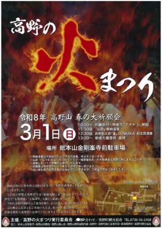 内容: 高野山の春を告げる山開き行事。山伏姿の僧侶によるダイナミックな「柴燈大護摩供(さいとうだいごまく)」が行われます。